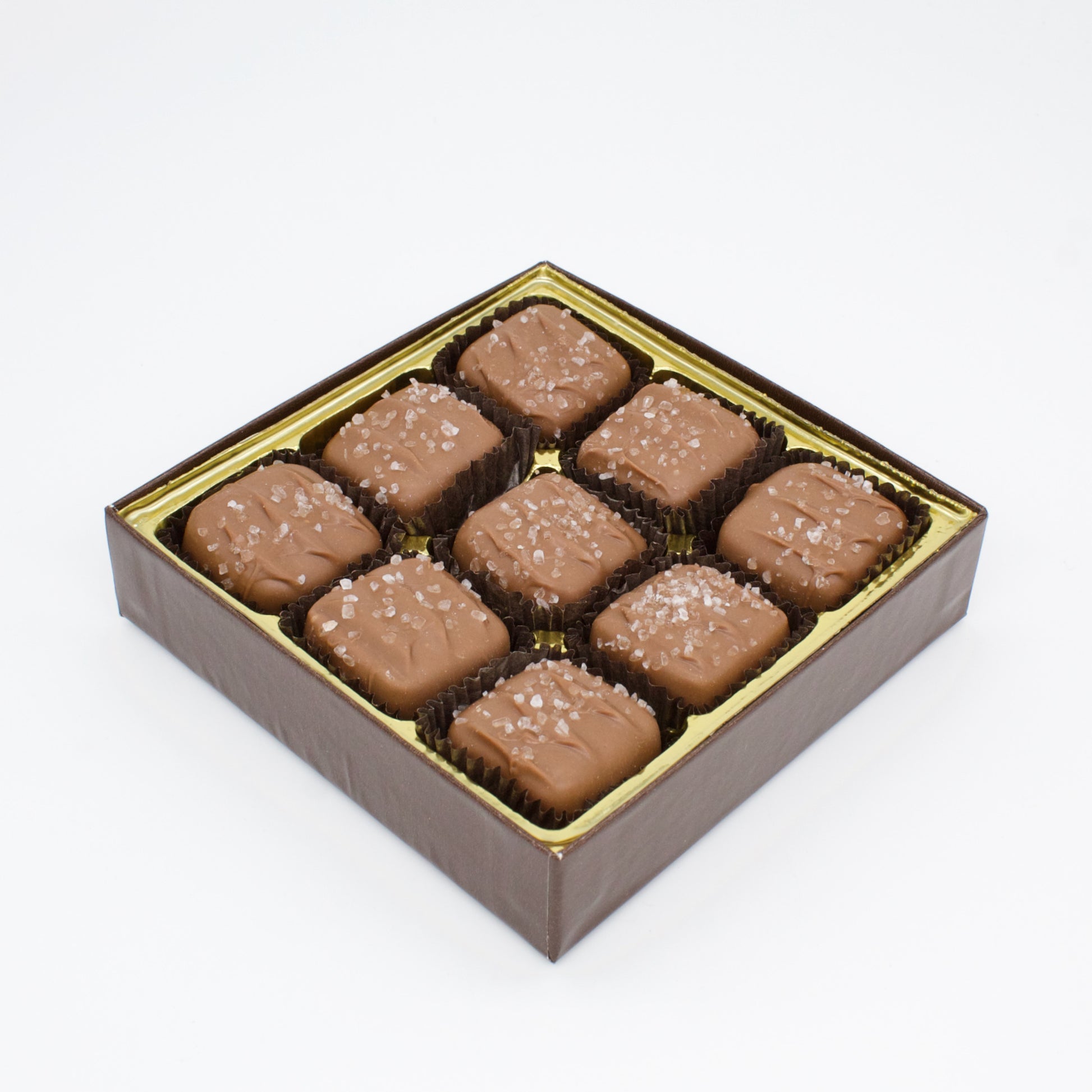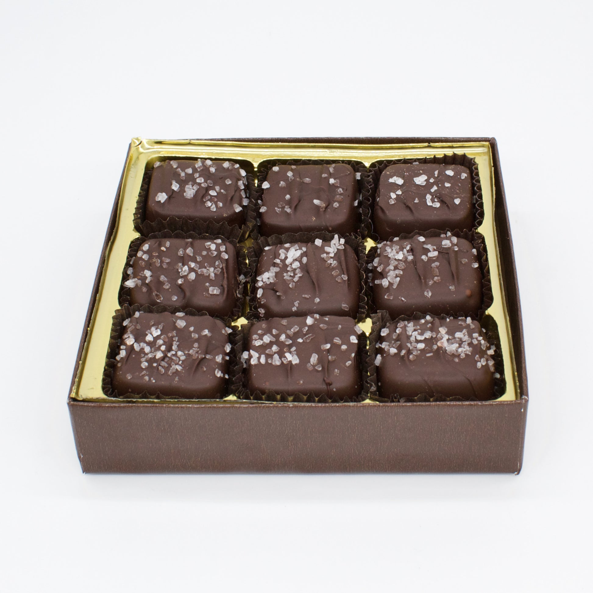 Our 9 Count Sea Salt Caramel Assortment features handcrafted buttery caramels enrobed in premium milk and dark chocolate and finished with delicate sea salt. Made in small batches for a perfectly balanced sweet and savory flavor, this gourmet caramel gift box delivers timeless elegance. An ideal chocolate gift for caramel lovers and refined palates alike.